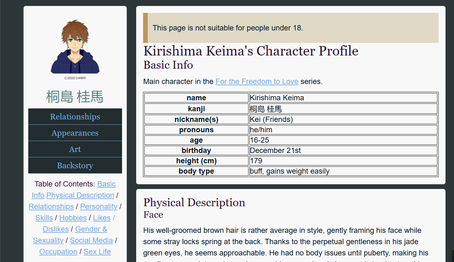 Screenshot of my OC Kirishima Keima's profile. It has a left sidebar with his avatar, name in kanji, and some links. The main section displays basic information like age and height and and cut off description about his physical appearance.
